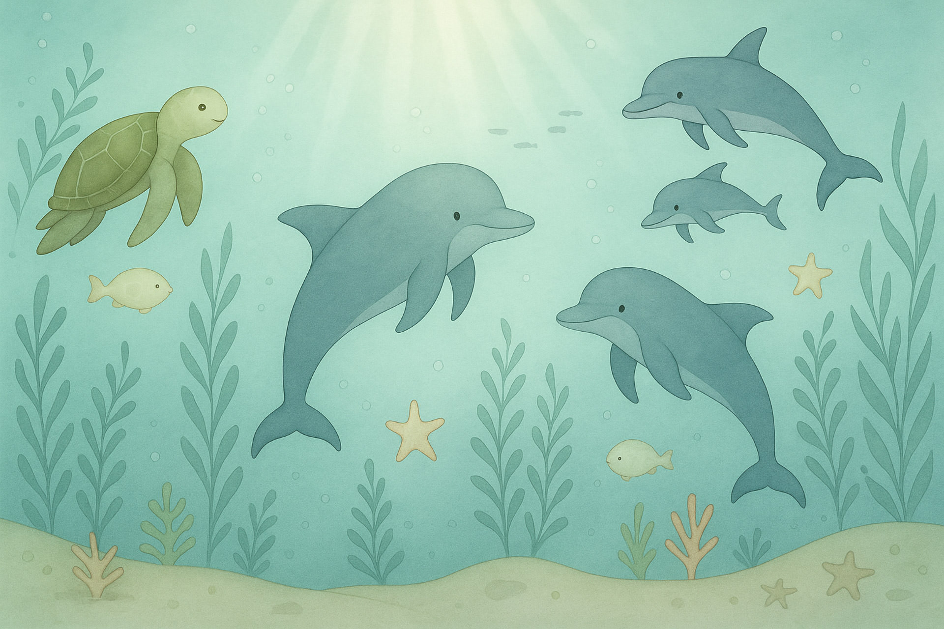 Bring the joy and playfulness of the sea to your child’s space with Dancing Dolphins, a whimsical nursery wallpaper filled with friendly marine life. Graceful dolphins leap and glide across a tranquil underwater setting, joined by a smiling turtle, curious fish, and gentle sea plants.