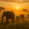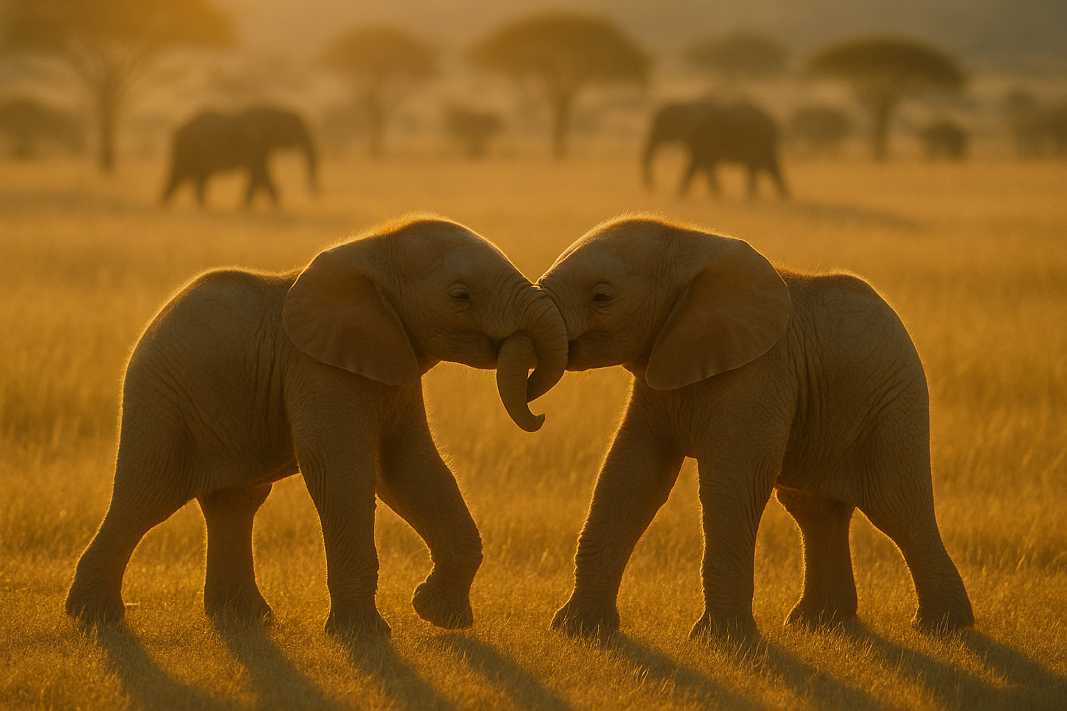 A heartwarming mural of baby elephants bonding in golden sunlight. Perfect for bringing joy, warmth, and love into your home.