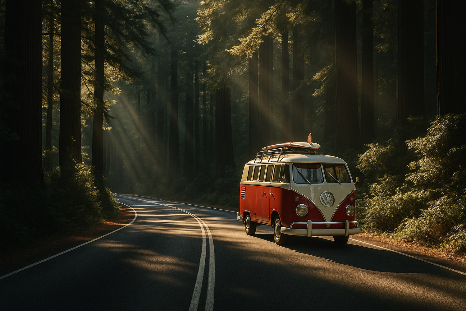 A peaceful mural of a vintage campervan driving through sun-drenched forest roads. Atmospheric, adventurous, and rooted in nature.