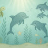 Introduce your little one to the serenity of the sea with Gentle Manatees, a soothing underwater wallpaper featuring a pod of smiling manatees gliding through a soft marine landscape. Accompanied by playful dolphins, peaceful turtles, starfish and shy fish, this mural captures the grace and gentleness of ocean life.