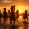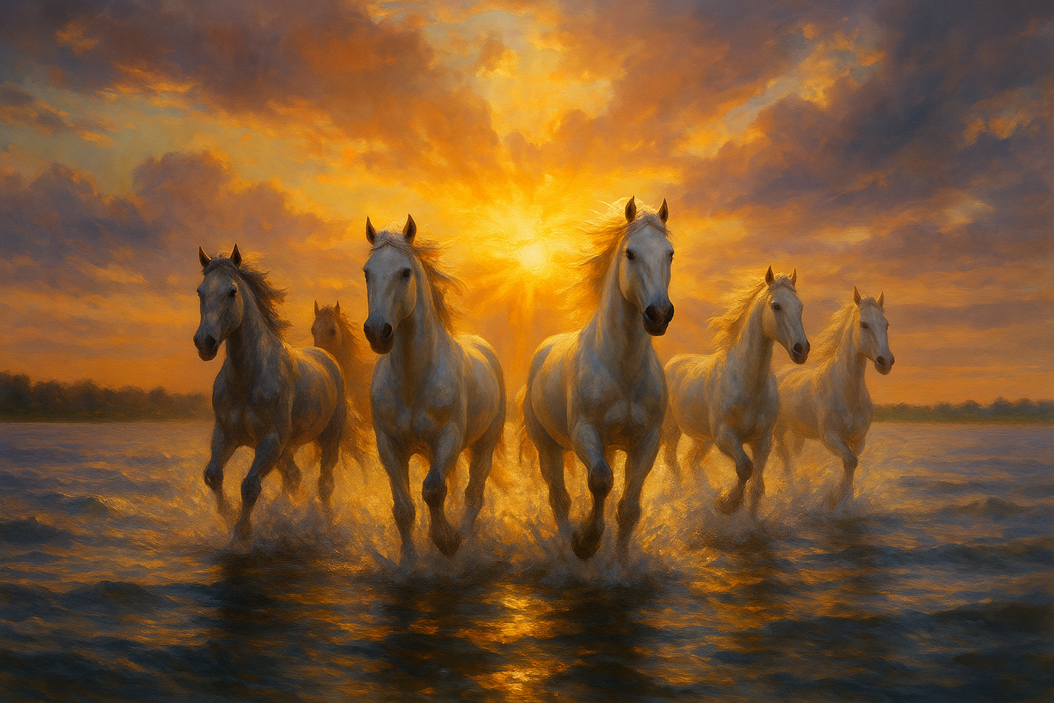 Set against a sky ablaze with amber, violet, and fiery coral hues, the horses appear almost celestial, their luminous coats catching the sun’s brilliance as water splashes in their wake. The brushwork glows with warmth, blending fine art sensibility with natural majesty. Ideal for dramatic statement walls, gallery-inspired interiors, or rooms seeking bold emotion and light.
