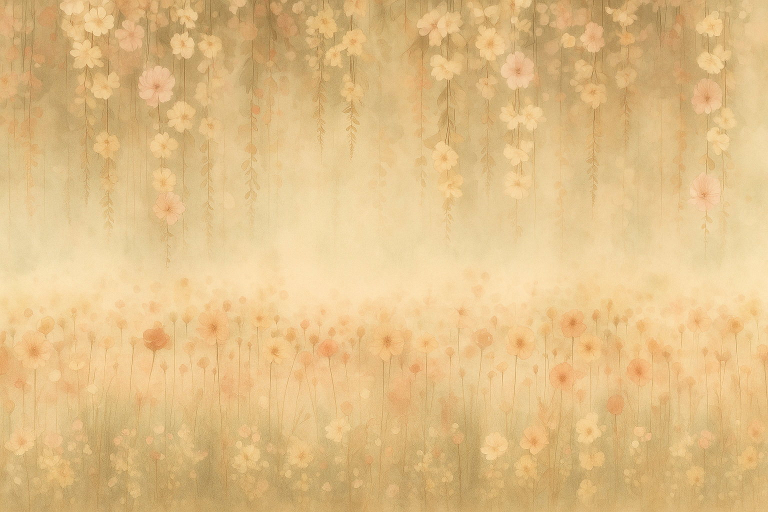 Trailing vines and suspended blooms descend from above, while the foreground brims with airy wildflowers swaying gently in the mist. This mural is ideal for creating a romantic, calming atmosphere in bedrooms, reading nooks, boutique cafes, or holistic spaces seeking warmth and elegance.