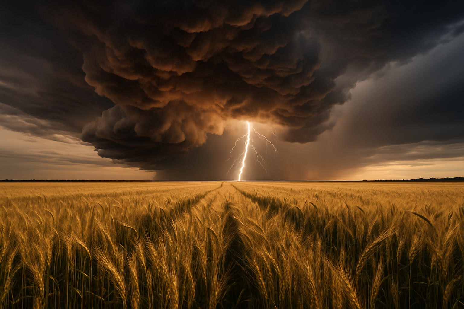 “Harvest Storm” freezes the primal moment where nature’s full force meets cultivated land. A bold lightning strike cracks through dense, brooding thunderheads, igniting the golden wheat field in a visual climax of fury and contrast. The rows of wheat part like an aisle leading directly into the mouth of the storm—where fate, yield, and chaos converge.