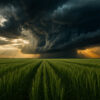 “Harvest Storm” unleashes a titanic skyscape over flat, furrowed farmland. A curtain of incandescent clouds looms with titanic density, lit by streaks of lightning that fracture the horizon. Beneath it, the open land lies stripped bare, a silent witness to the heavens in revolt. This image captures not just weather—but raw elemental theatre.