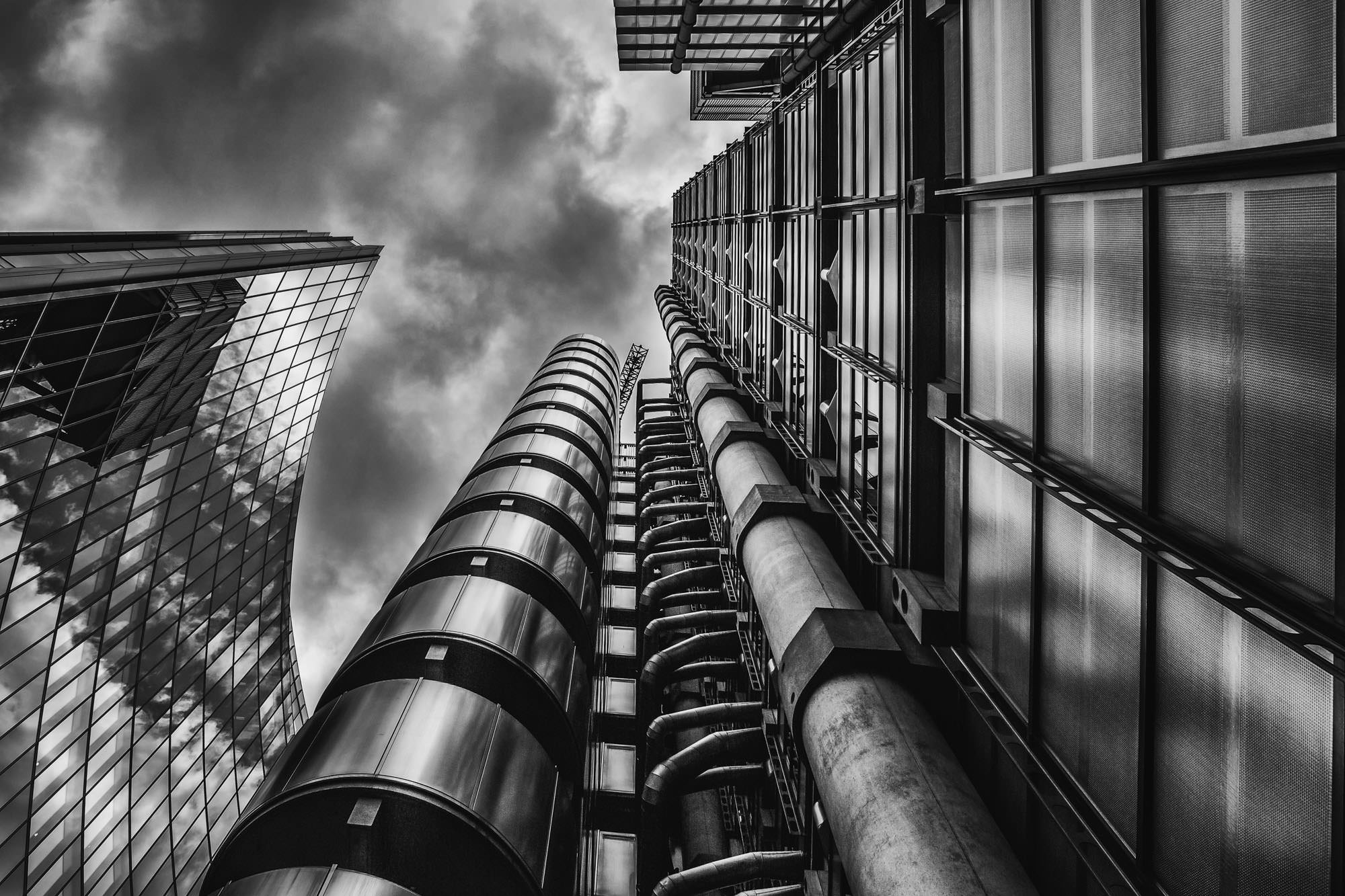 A striking black-and-white mural of London’s Lloyd’s Building, showcasing its iconic exposed structure and high-tech design. Bold, industrial, and architecturally rich.