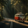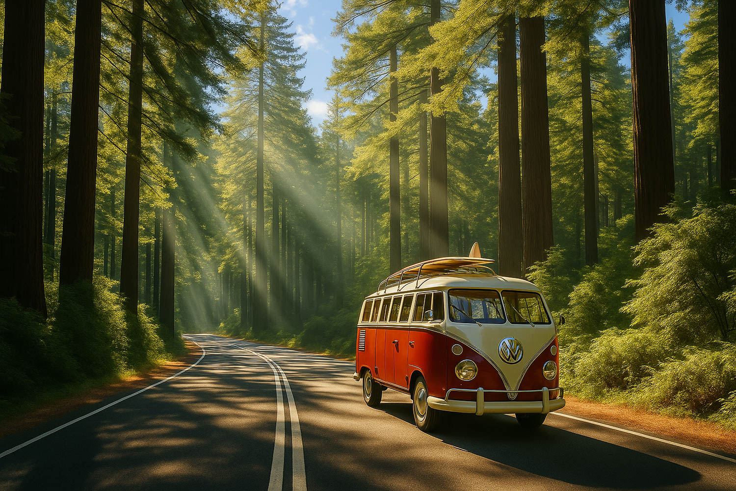 A sunlit forest mural featuring a vintage VW camper cruising a winding woodland road. Bright, uplifting, and full of adventurous spirit.