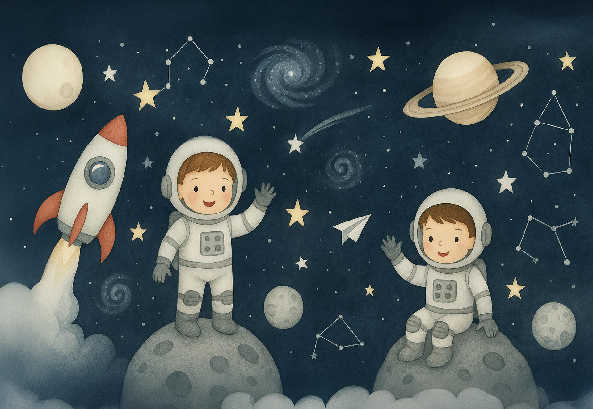 A magical starry mural featuring little astronauts, rockets, planets and constellations – perfect for a space-loving nursery or adventurous playroom.
