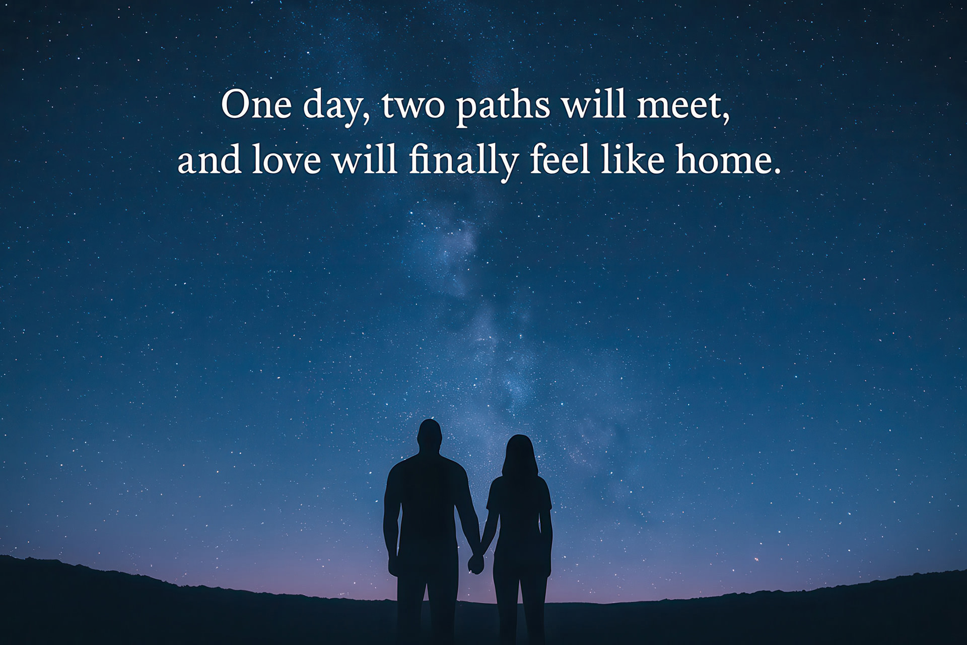 A touching moment captured beneath a star-filled sky — two silhouettes standing hand in hand, united under the Milky Way. The words “One day, two paths will meet, and love will finally feel like home.” remind us that love is destiny written in the stars. Perfect for bedrooms, living spaces, or as a heartfelt gift for anniversaries and weddings.